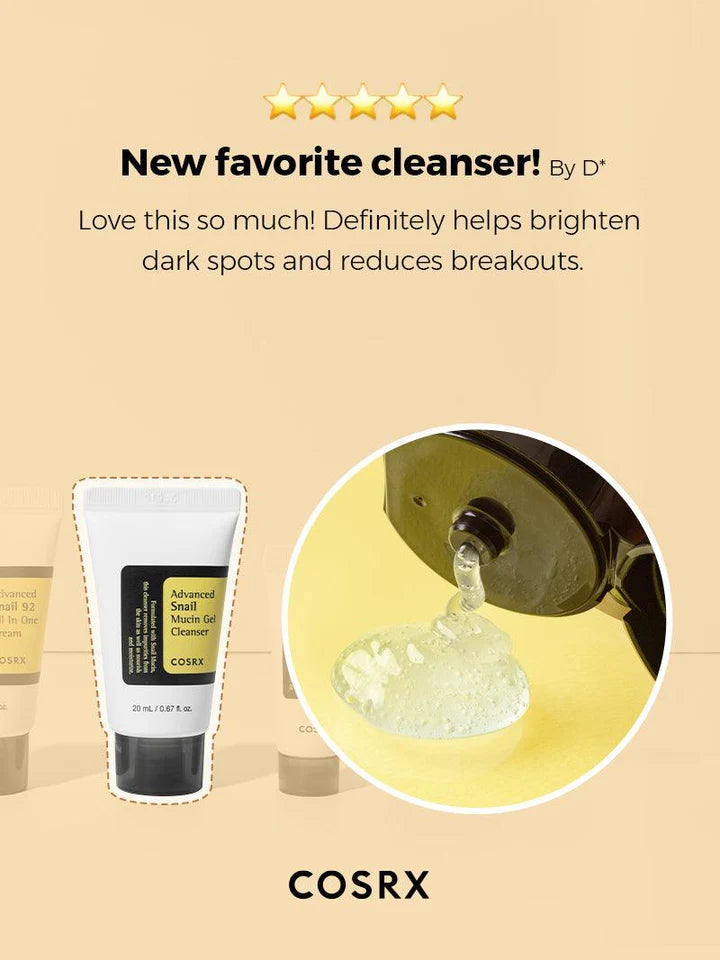 Contents/Volume: - Advanced Snail Mucin Gel Cleanser 20 ml · - Advanced Snail 96 Mucin Power Essence 30 ml · - Advanced Snail Peptide Eye Cream 5 g · - Advanced Snail 92 All In One Cream 20 g