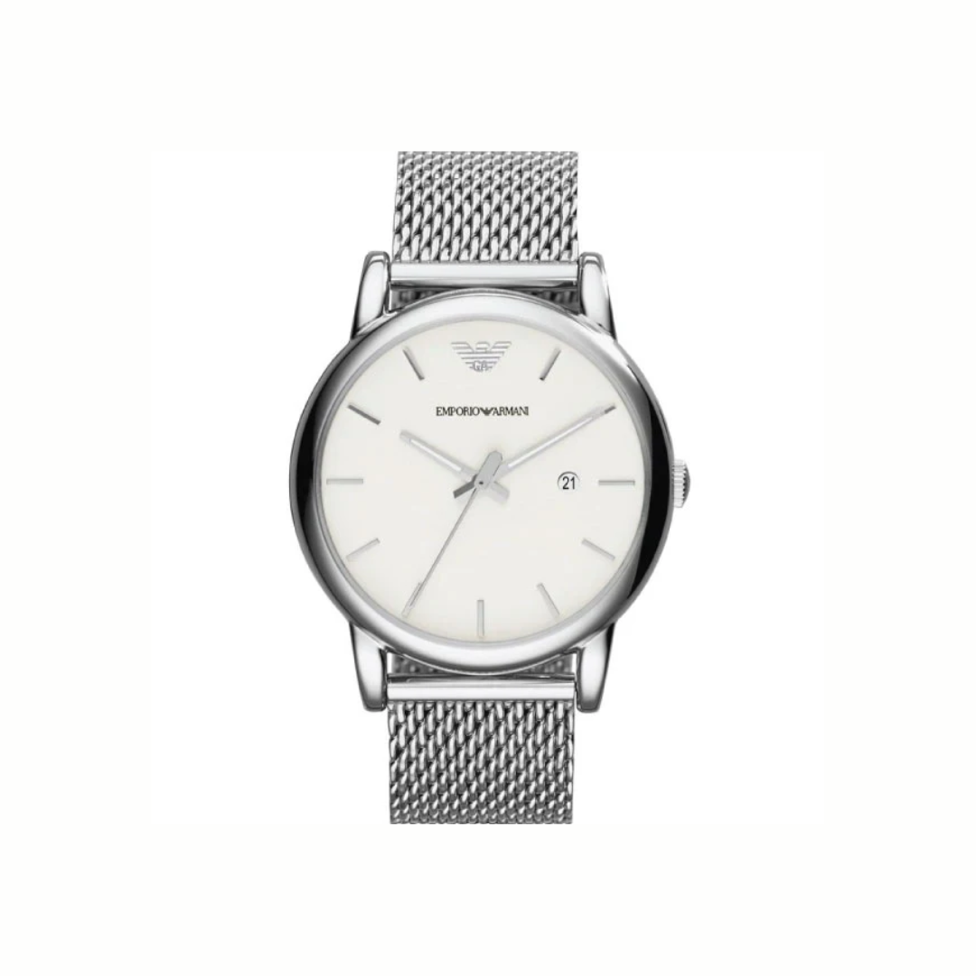 Emporio Armani Luigi Silver Mesh Bracelet White Dial Quartz Watch for Gents 43mm (AR1812): With its sleek 43mm white dial and elegant silver mesh bracelet, this Emporio Armani watch is the epitome of minimalist sophistication.