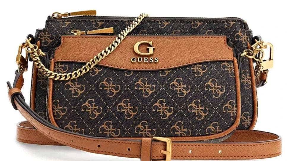 GUESS NELL Women’s Double Zip Pouch Brown Logo, 2x Crossbody Shoulder Bag