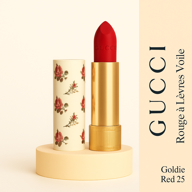 The Gucci Rouge à Lèvres Voile in 25 Goldie Red is an essential for those who love a luminous, effortless look. With its hydrating formula, sheer finish, and luxurious design, it’s the perfect balance of comfort, elegance, and timeless beauty.