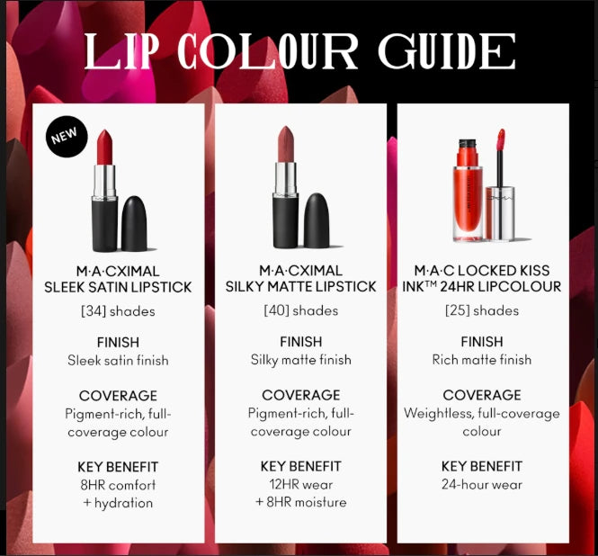 MAC M·A·CXIMAL Sleek Satin Lipstick delivers a rich, high-impact color experience with a smooth, luminous satin finish that feels as good as it looks. Designed to elevate your everyday makeup routine, this lipstick combines bold pigment with deep hydration for lips that look polished, plush, and healthy.