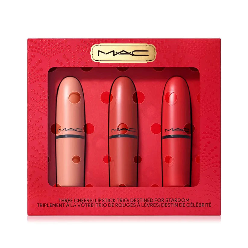The MAC Limited Edition Three Cheers! Lipstick Trio is a must-have for makeup lovers. Whether you're looking for a bold holiday lip or an everyday classic, this trio offers luxurious pigment, long-lasting wear, and timeless elegance.