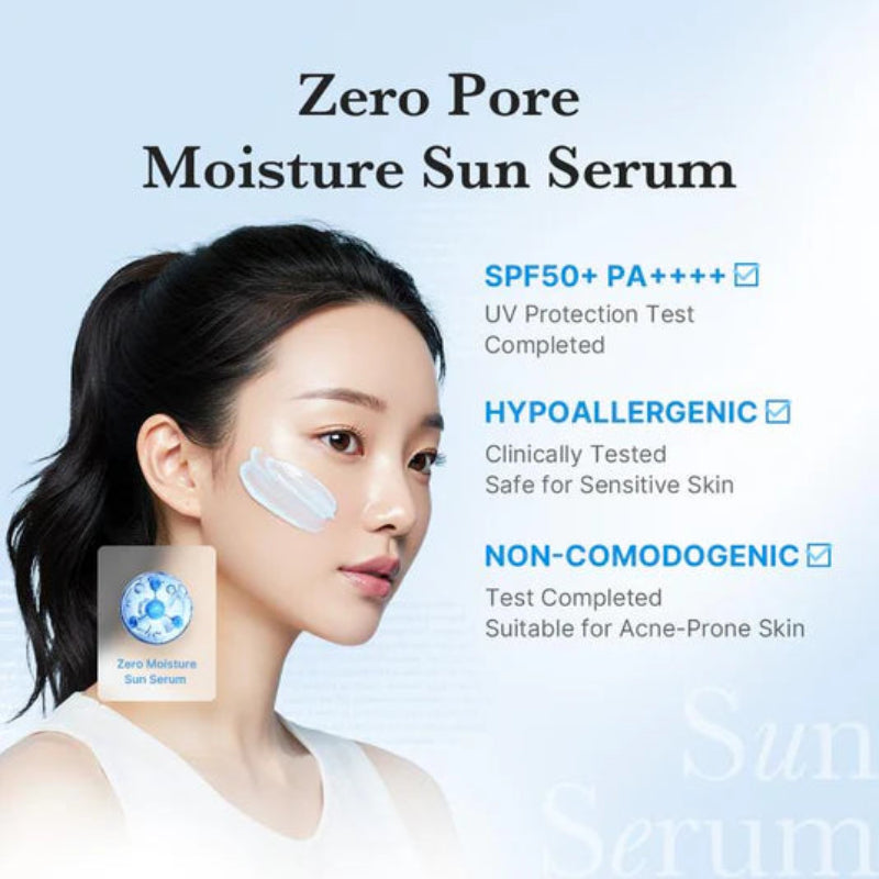 Medicube Zero Pore Moisture Sun Serum SPF50+ PA++++ is an ultra-light daily sunscreen–serum hybrid that protects, hydrates, and helps keep pores clear. Powered by 10 types of Hyaluronic Acid with Panthenol & Allantoin, it layers seamlessly under makeup with a fresh, no-white-cast finish — ideal for Pakistan’s hot, humid weather.