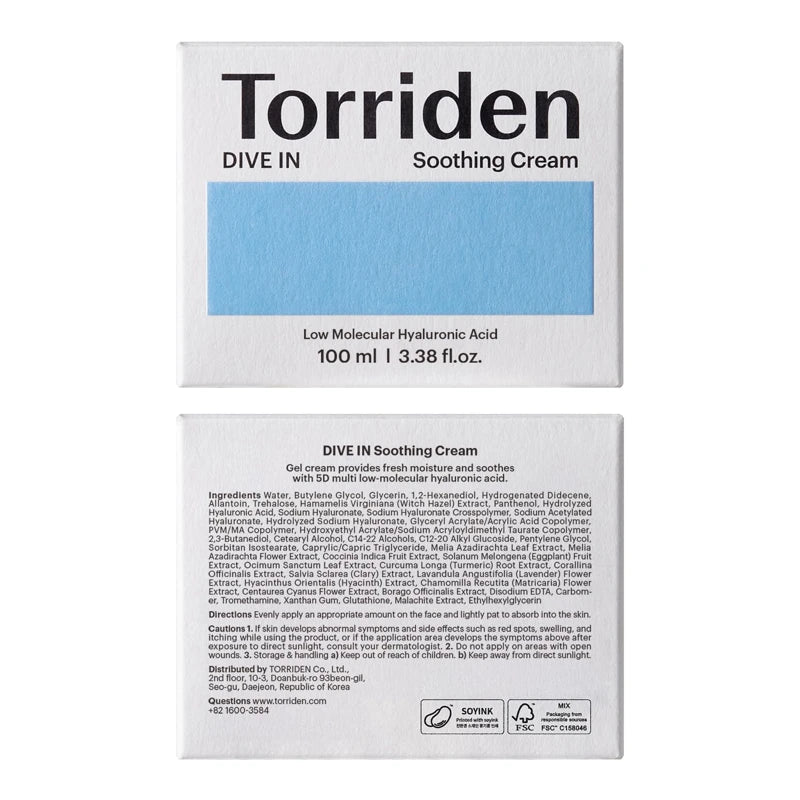 Torriden DIVE IN Hyaluronic Acid Soothing Cream is a lightweight gel-cream moisturizer powered by 5D low molecular hyaluronic acid designed to hydrate deep within the skin while delivering instant cooling relief. Its refreshing texture absorbs quickly, making it ideal for all skin types—including sensitive and dehydrated skin.